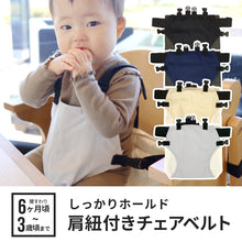 背もたれにベルトを回して固定し、子どもを座らせてベルトで安全に固定します。